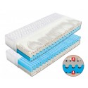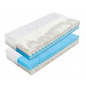 Pevnější matrace se špičkovou pěnou Cellflex (40 kg/m³), která je díky vysoké hustotě velmi odolná a zaručí dlouhou životnost Vaší matrace. Její zářezy v exponovaných místech přispívají k dokonalé opoře ležícího těla (pod rameny a boky se více prohne a odpruží). Pěna Cellflex je doplněna poddajnější pěnou PanterFoam ve výšce 3cm (50 kg/m³), která je velmi vzdušná a elastická, proto tvoří měkčí stranu této matrace (tvrdost č. 3). Naproti tomu pevnější strana (tvrdost č. 4) je tvořena vysoce gramážní modrou pěnou MediFoam (35 kg/m³), která i při vyšší hustotě optimalizuje rozložení tlaku na matraci. Na jejím povrchu najdete speciální ventilační zářezy. Jádro matrace je provzdušněné vlnkovitým prořezem, důležitým pro větší prodyšnost matrace a dokonalou spolupráci obou pěn. Celková výška matrace cca 25 cm.